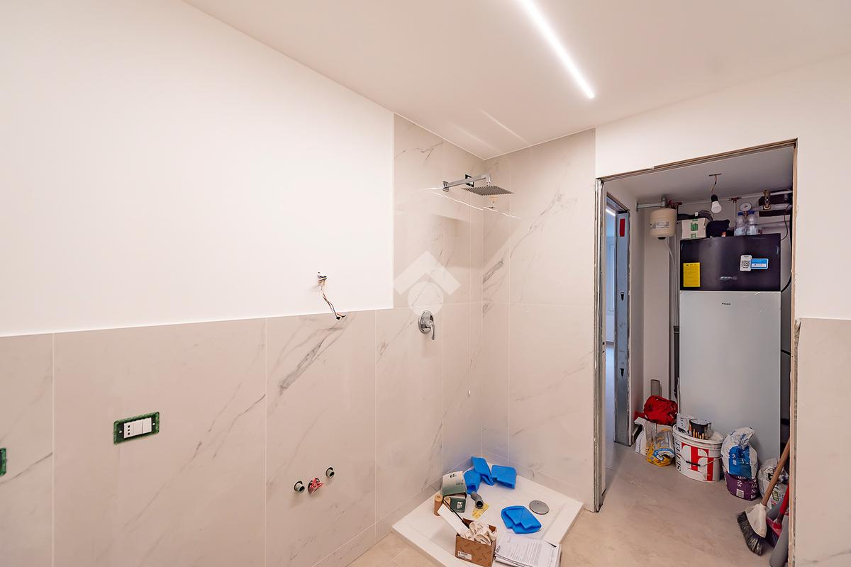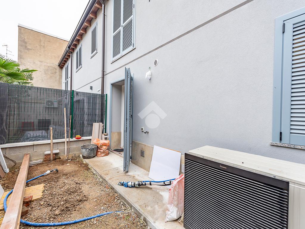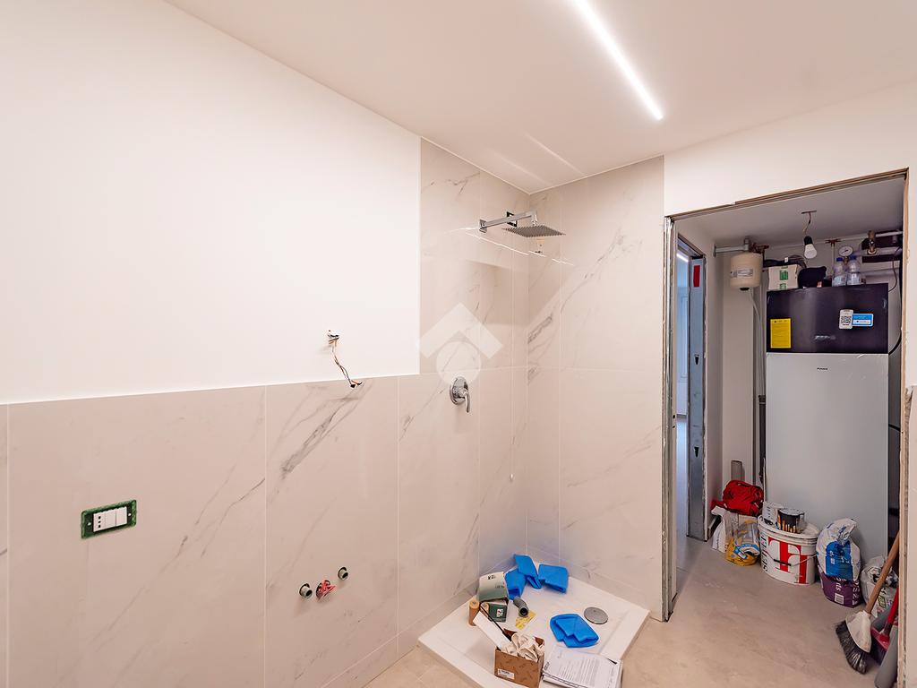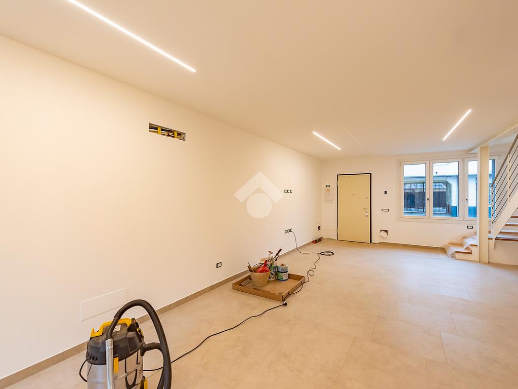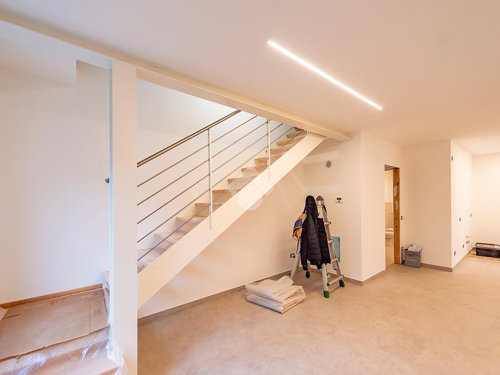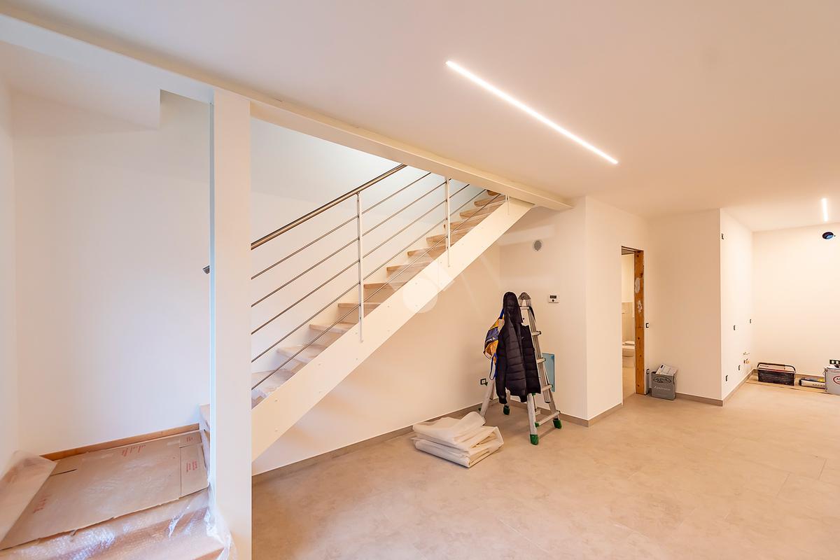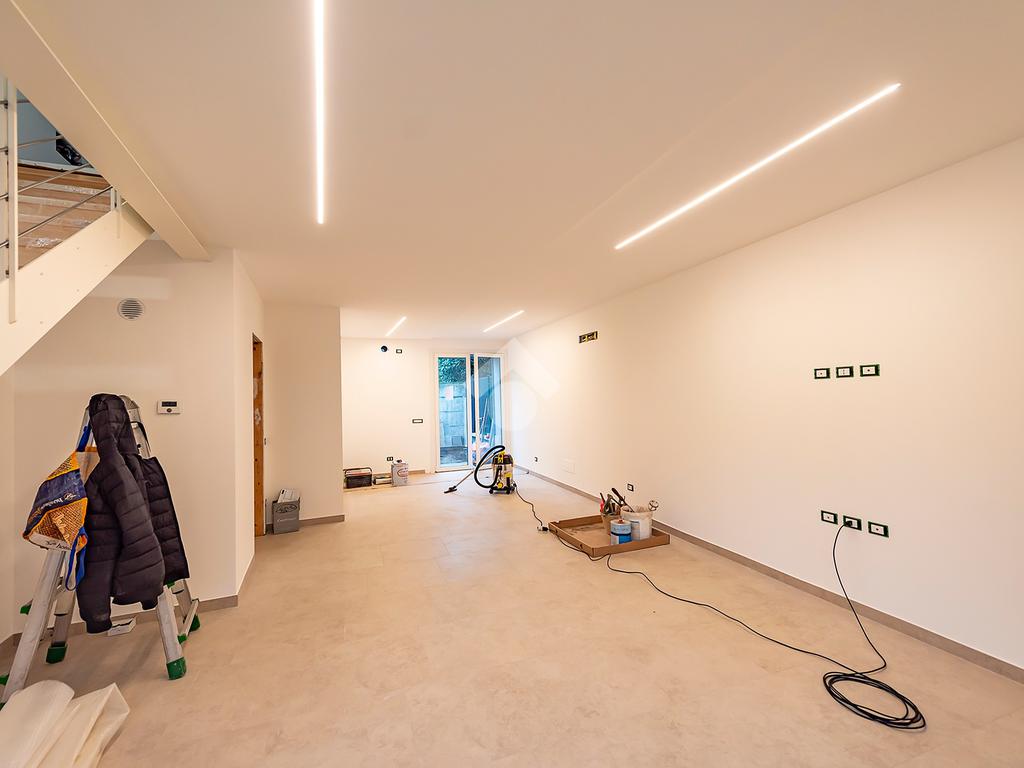 L’ingresso si apre su un luminoso soggiorno con cucina a vista, uno spazio accogliente e ben distribuito, ideale per vivere la quotidianità e ricevere ospiti in un contesto elegante e contemporaneo. Dal soggiorno si accede direttamente a un comodo spazio esterno, perfetto per momenti di relax all’aria aperta, pranzi estivi o per chi ama avere un angolo verde da personalizzare. Al piano terra è presente un bagno di servizio, pratico e rifinito con materiali di qualità.